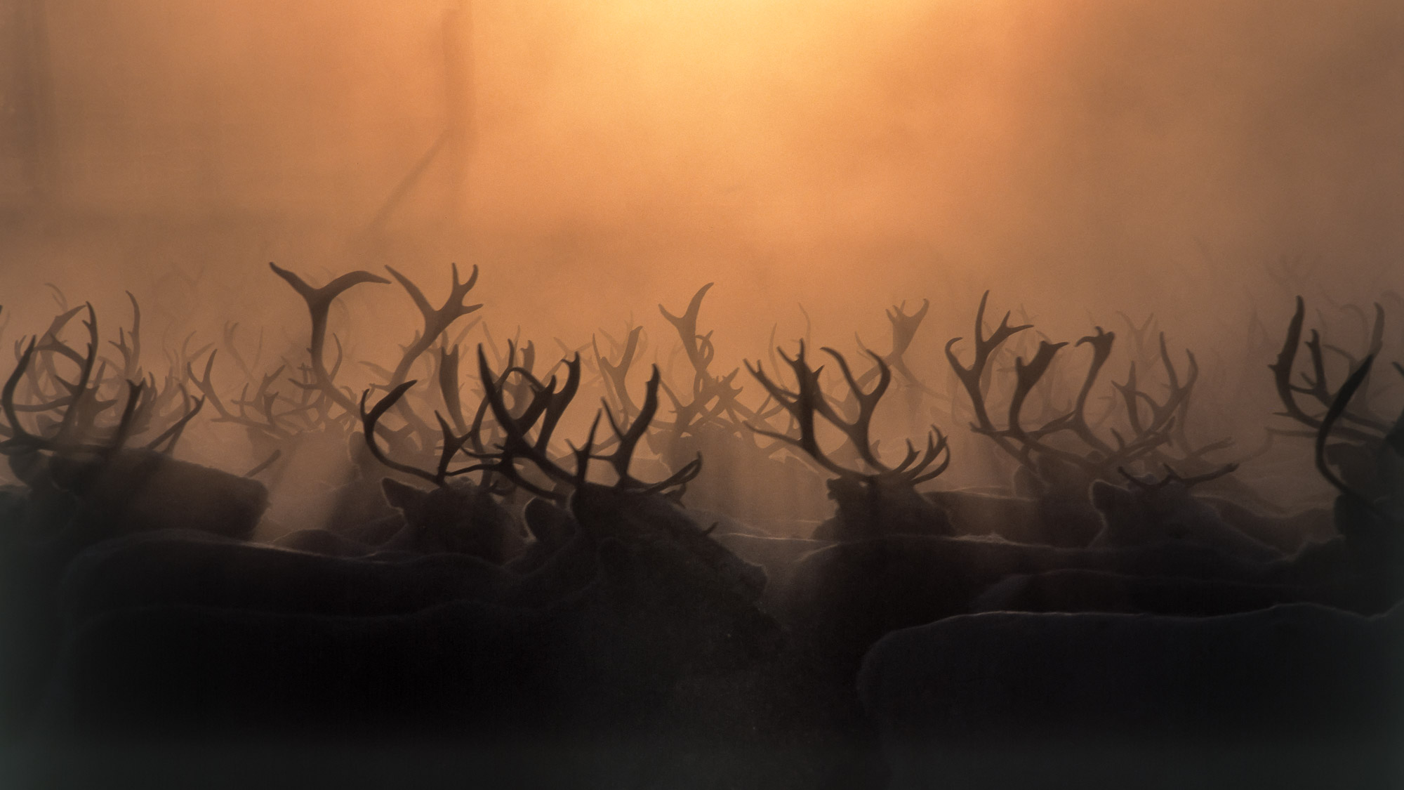 The breath of the reindeer turns to steam, their antlers weaving a slow dance in the dust of snow.
